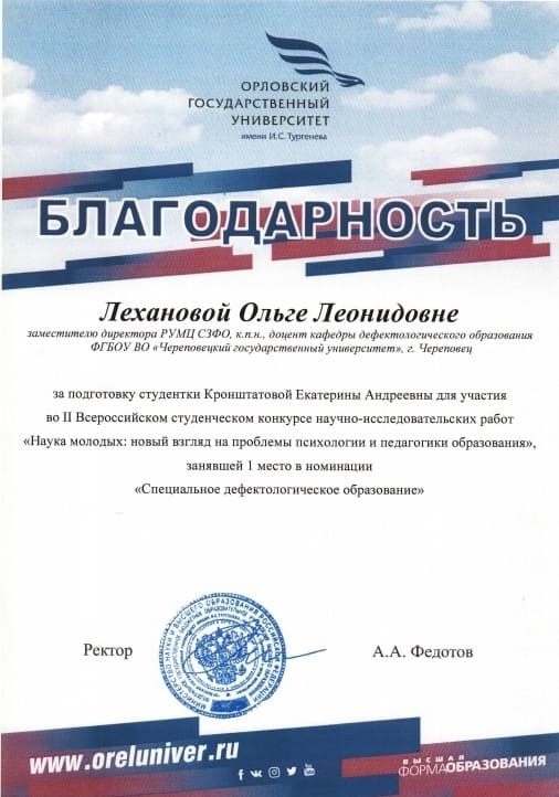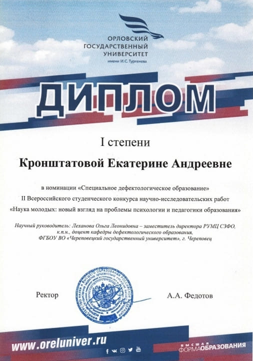 Научно-исследовательскую работу Екатерины Андреевны Кронштатовой, студентки кафедры дефектологического образования, высоко оценили в Орловском государственном университете имени И.С. Тургенева.