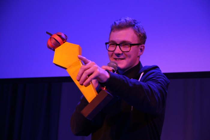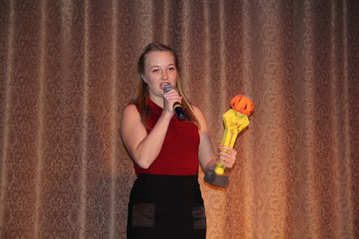 Самый интригующий момент вечера – объявление победителей. «Золотую тыкву» в номинации «Лучшее видео с участием одного человека» получил Юрий Кочуров (группа 1ИВТ-21). Награду ему принесла жуткая история под названием «English till dawn» о том, что нужно делать задания по английскому вовремя. Речь победителя была предельно лаконичной: