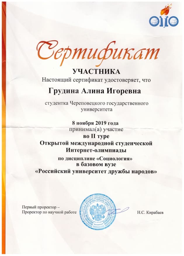 Студентка 4 курса направления подготовки «Социология» Алина Игоревна Грудина стала золотым призером Открытой международной интернет-олимпиады по социологии. Ее заключительный тур прошел на базе Российского университета дружбы народов (РУДН).