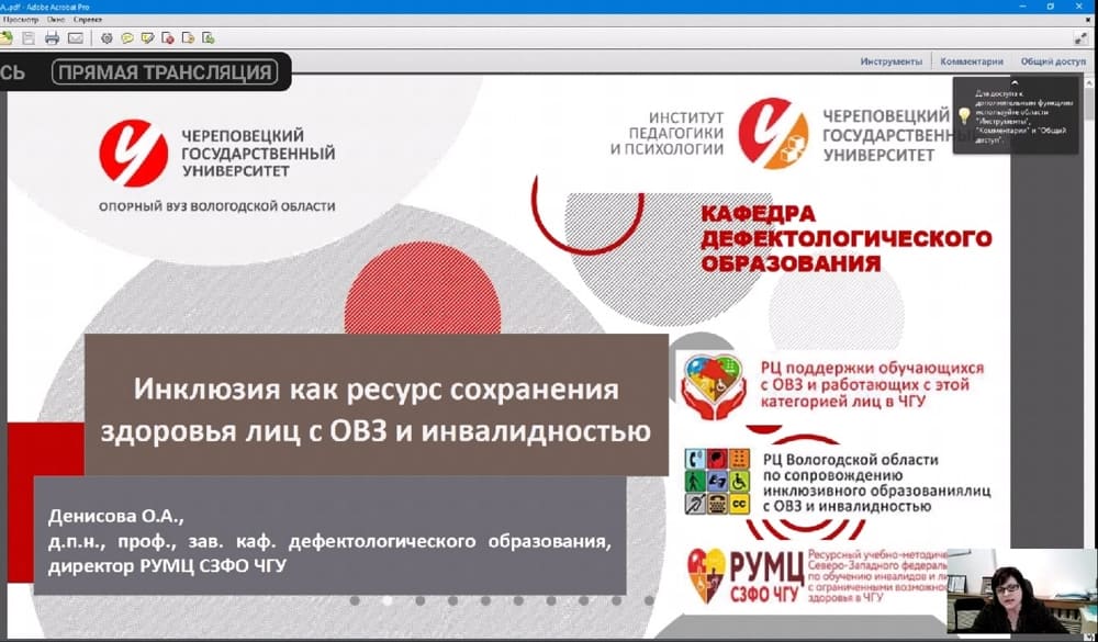 Спикером от Череповецкого государственного университета выступила Ольга Александровна Денисова, заведующий кафедрой дефектологического образования, директор РУМЦ СЗФО ЧГУ. Ее доклад был посвящен инклюзии как ресурсу сохранения здоровья лиц с ограниченными возможностями здоровья и инвалидностью.