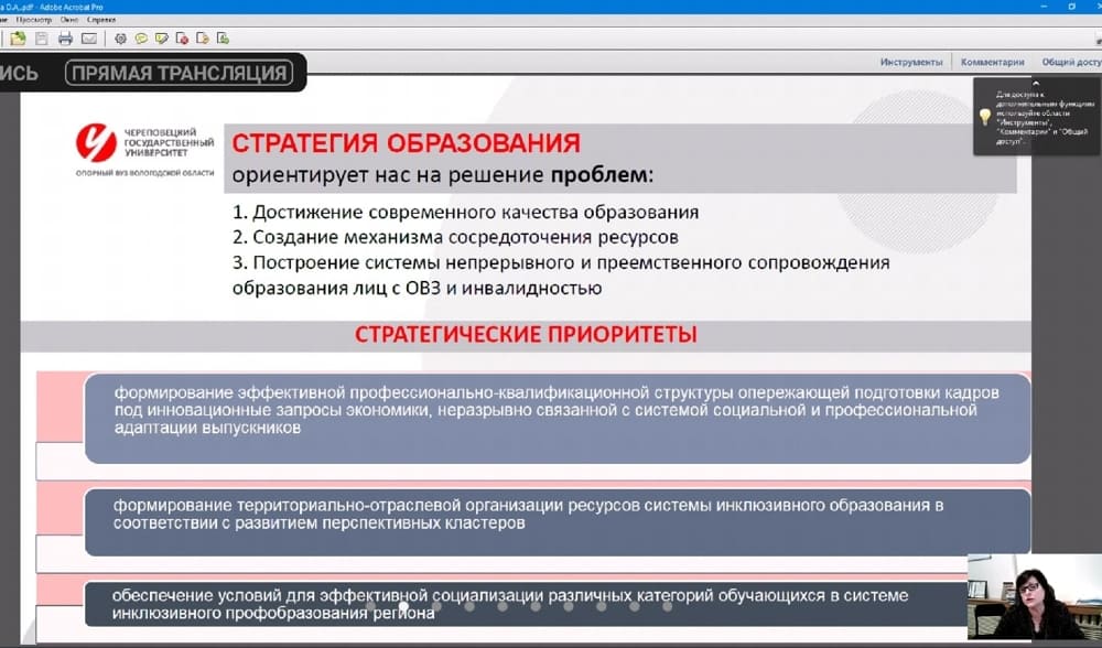 «В числе стратегических приоритетов, во-первых, формирование эффективной профессионально-квалифицированной структуры опережающей подготовки кадров под инновационные запросы экономики, неразрывно связанной с системой социальной и профессиональной адаптации выпускников. Во-вторых, формирование территориально-отраслевой организации ресурсов системы инклюзивного образования в соответствии с развитием перспективных кластеров. В-третьих, обеспечение условий для эффективной социализации различных категорий обучающихся в системе инклюзивного профобразования региона».