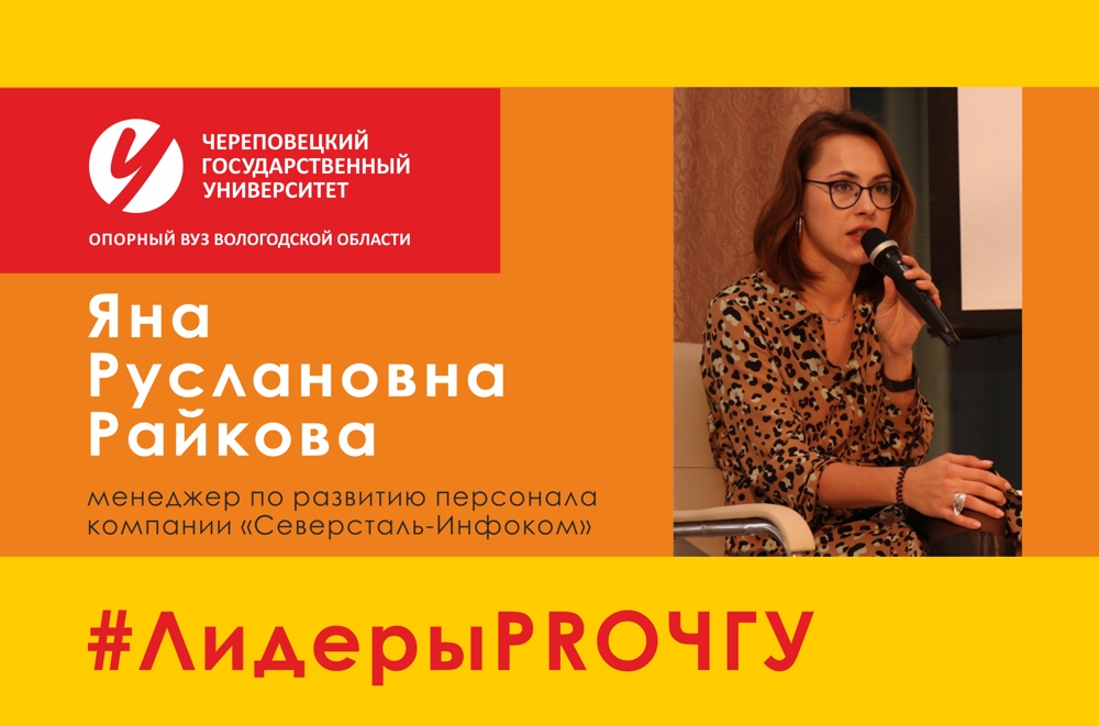 В рубрике «Лидеры PRO ЧГУ» представляем Яну Руслановну Райкову, менеджера по развитию персонала компании «Северсталь-Инфоком», которая высоко оценила сотрудничество наших организаций, пообщалась со студентами и дала им профессиональные советы.