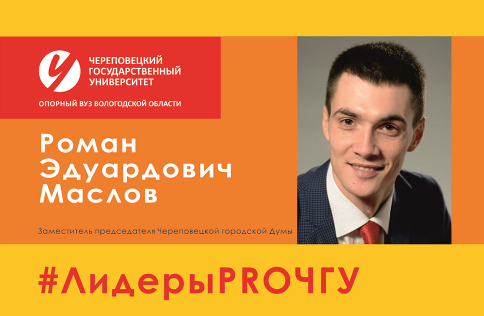 В Рубрике «Лидеры PRO ЧГУ» – Роман Эдуардович Маслов, заместитель председателя Череповецкой городской Думы.