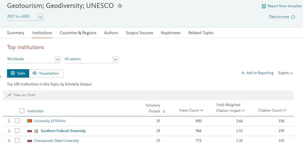 Для определения научного профиля вуза и его положения среди других университетов мира используется инновационный инструмент анализа мировых научных данных "SciVal" – разработка нидерландской компании "Elsevier". С его помощью установлено, что с учетом научных публикаций с 2017 г. ЧГУ вошел в "тройку" ведущих мировых вузов по исследовательской тематике T.14792 "Geotourism; Geodiversity; UNESCO". Эта область знаний объединяет исследования, направленные на изучение геологического наследия территорий, его экономического и рекреационного значения, а также устойчивого развития геологически значимых территорий. Данная тематика является междисциплинарной и требует привлечения специалистов из области геологии, экономики, экологии, археологии и ряда других наук. При этом она еще и исключительно востребована мировой наукой. Об этом говорит показатель ее актуальности, рассчитываемый с помощью "SciVal". Ежегодно ведущие мировые научные журналы публикуют до нескольких сотен статей с результатами соответствующих исследований. В этом отношении ЧГУ конкурирует с такими известными исследовательскими центрами как Университет Лозанны в Швейцарии и Миланский Университет в Италии.